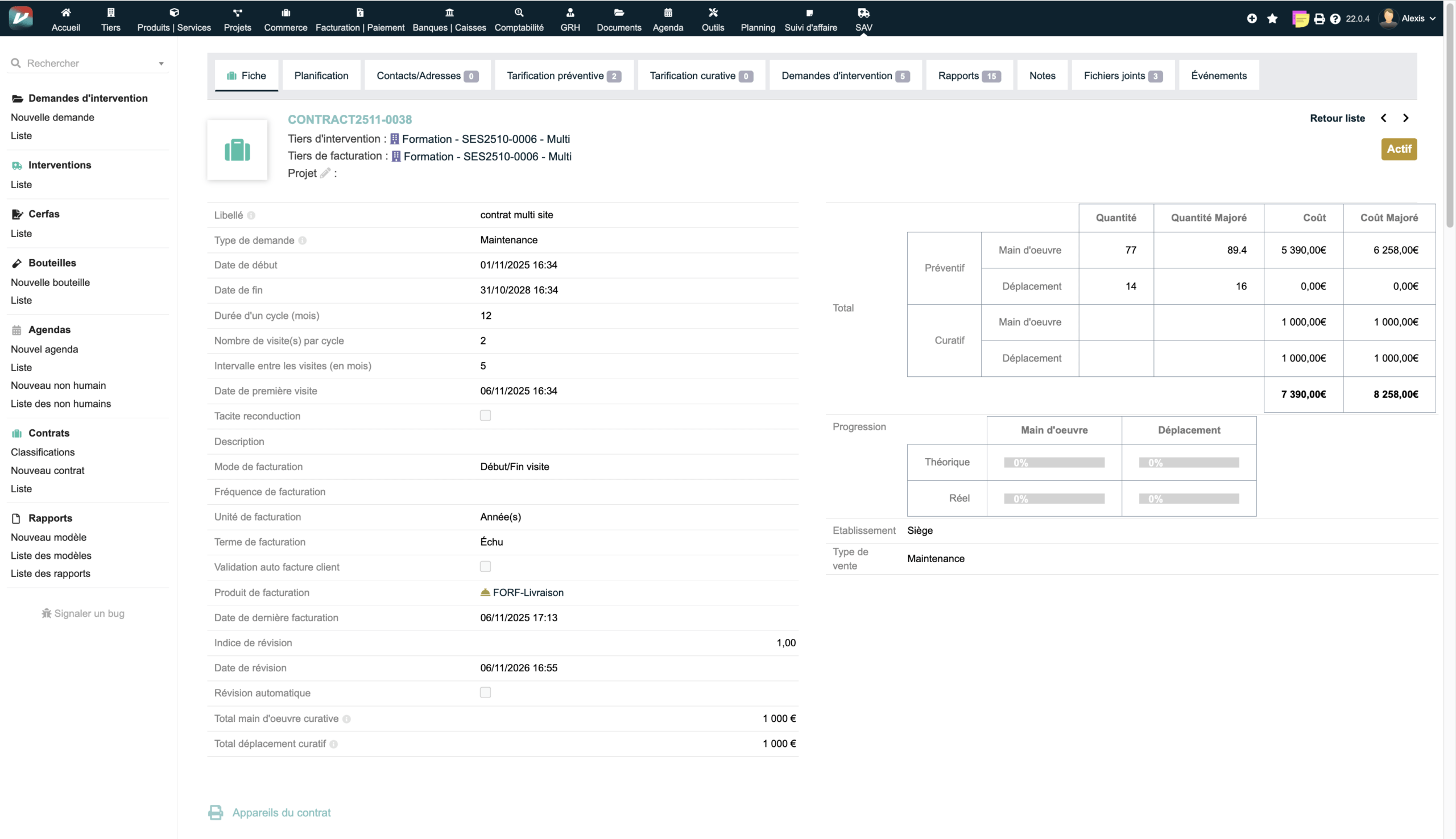 Grâce à l’automatisation de certaines tâches, comme la facturation récurrente ou l’association des interventions aux contrats, les équipes gagnent du temps et sécurisent leur activité. Le module devient ainsi un véritable outil de pilotage pour développer et structurer votre activité de maintenance.