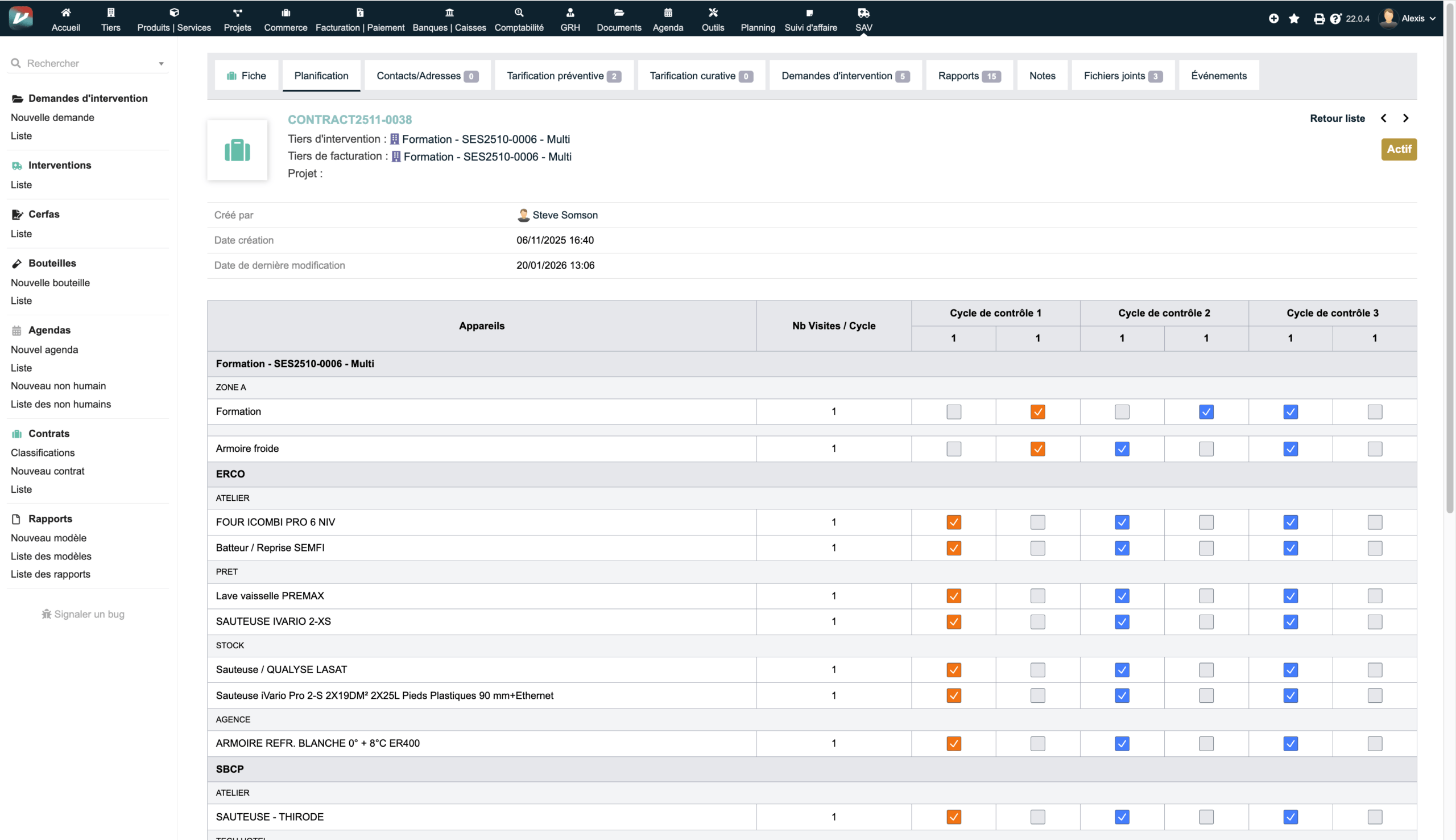 Les contrats sont directement liés aux clients, aux équipements et aux interventions, ce qui permet d’avoir une vision claire des services fournis et des engagements en cours. Les échéances sont suivies automatiquement pour anticiper les renouvellements et garantir la continuité de service.