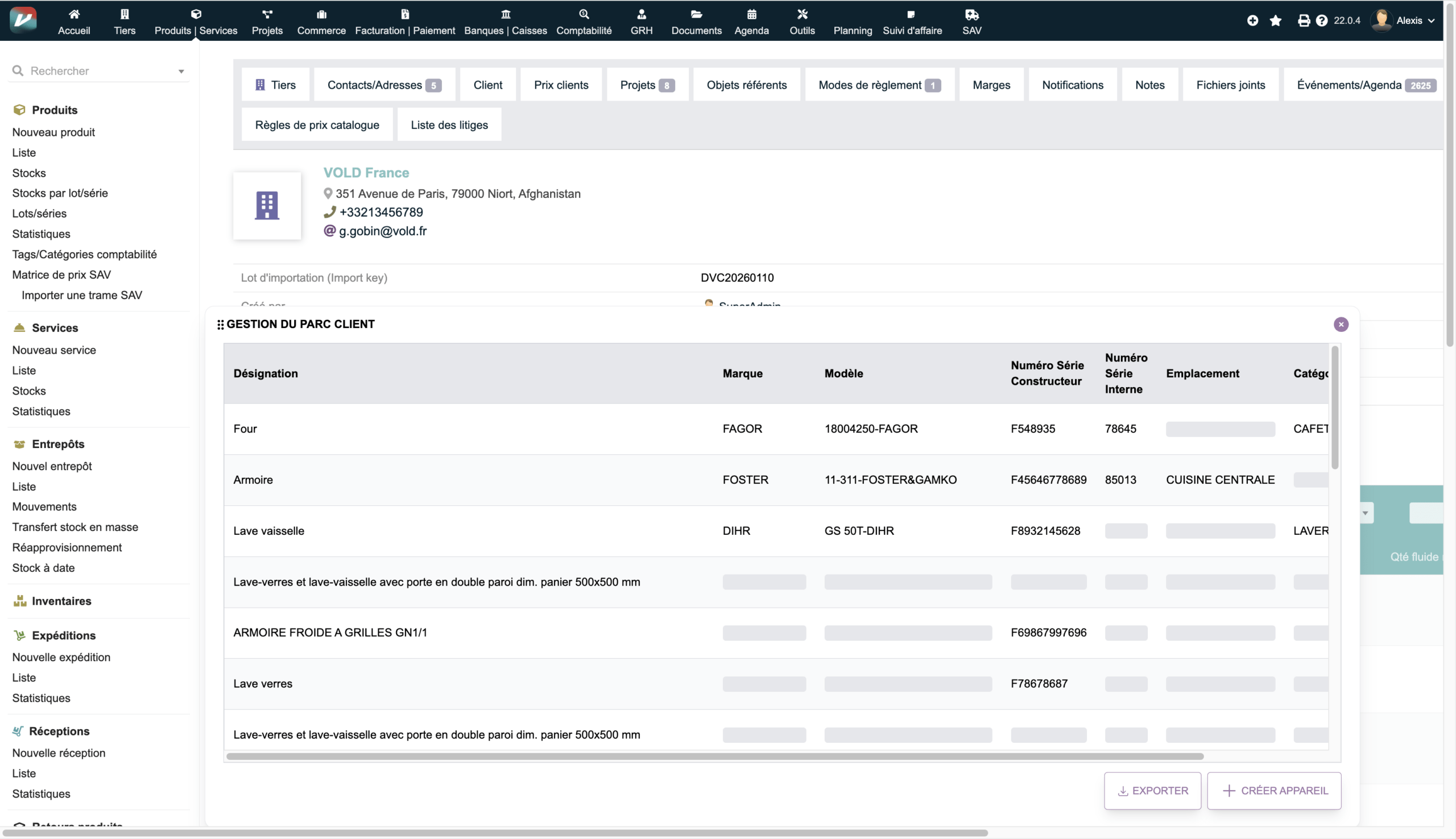 Le module Gestion de parc SAV de DoliVOLD permet de référencer et suivre l’ensemble des équipements installés chez vos clients. Chaque machine, installation ou matériel peut être enregistré avec ses informations techniques, son numéro de série et ses documents associés.